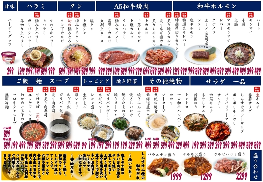 - 今まで焼肉屋が捨てていたカルビの部位を弊社のノウハウで商品化し、A5ランクの黒毛和牛上カルビを699円(税抜)で提供可能に。また、低価格の集客商品と高粗利の利益商品を組み合わせた「メリハリ戦略」により生ビールを299円(税抜)で提供可能。さらに本部CKによるホルモン一頭買いを行うことで高品質×低価格の価格戦略。3本の戦略により、焼肉業界の水準を下回る原価率37%を実現。競合他社が真似することを嫌がるほどの唯一無二のポジショニングを確保できます。