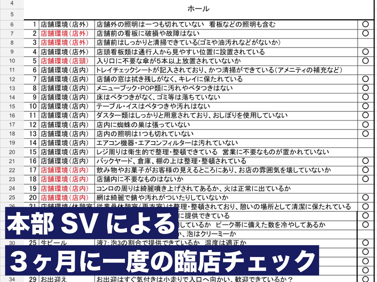 - 本部のスーパーバイザーが臨店調査を行い、店舗力の維持と改善をご提案。オーナー様が現場を離れ、多店舗展開できる体制を整えております。